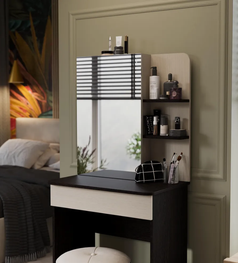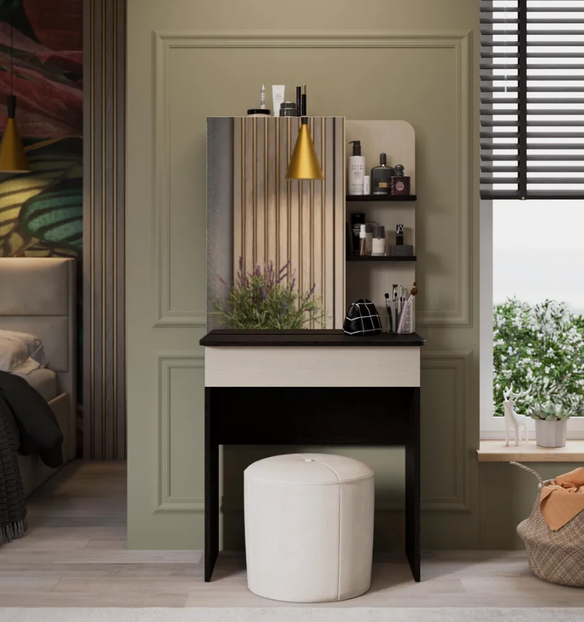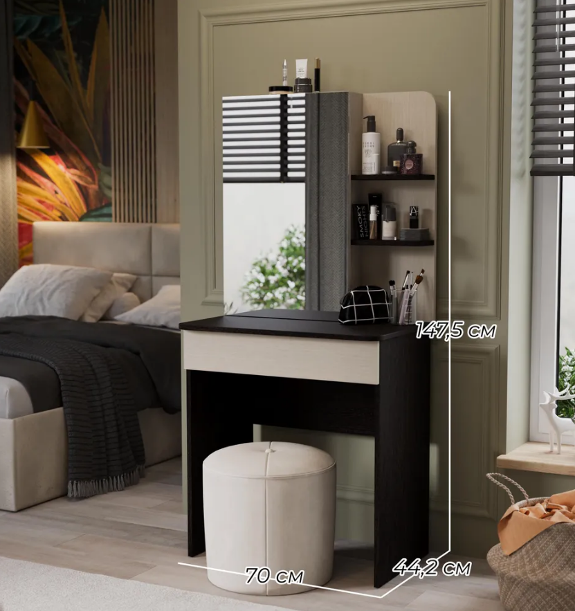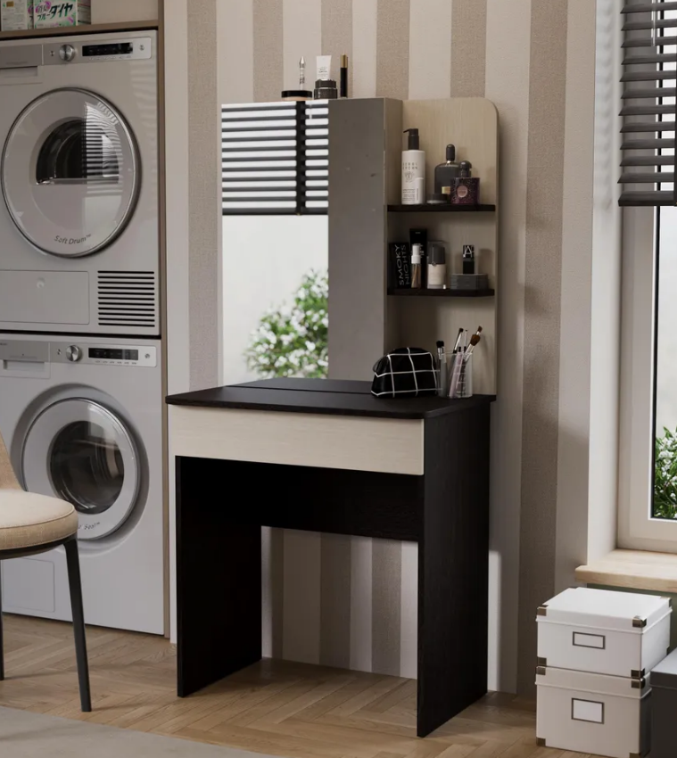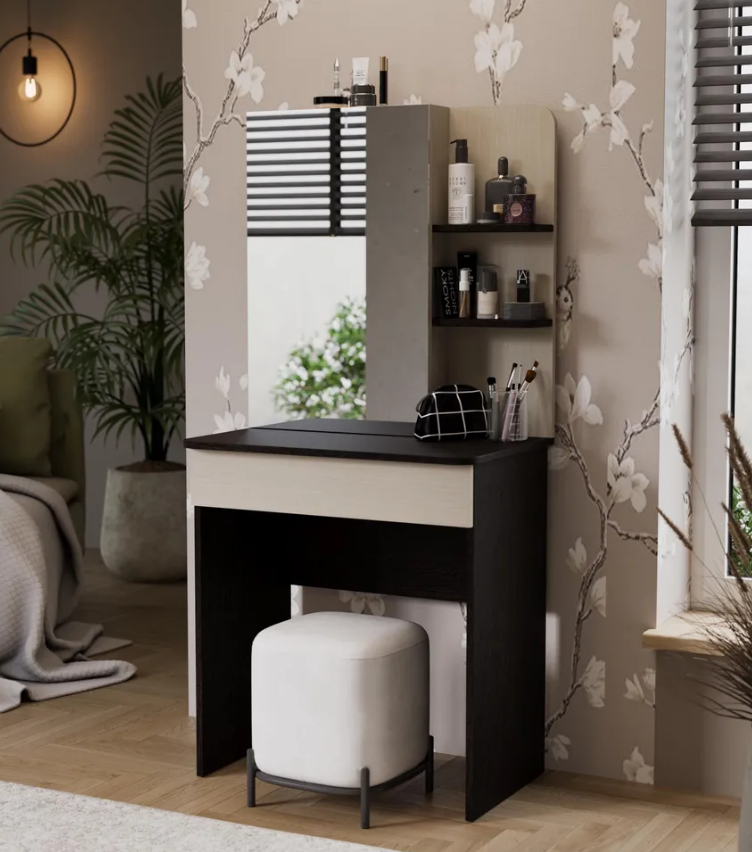 • Каркас новинки выполнен из прочной ламинированной древесно-стружечной плиты, обработанной кромкой ПВХ, которая устойчива к сколам и механическим повреждениями и сохраняет свой первоначальный цвет даже под воздействием солнца. При этом материалы экологически безопасны и соответствуют высоким стандартам качества. • В туалетном столике «Майя» есть приятное дополнение. За зеркалом имеются дополнительные скрытые полки для хранения, которые спасут столик от загромождённости и освободят место для предметов декора.