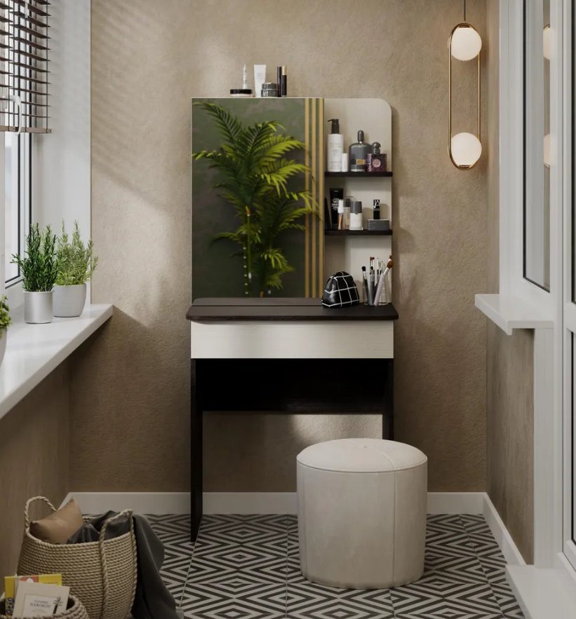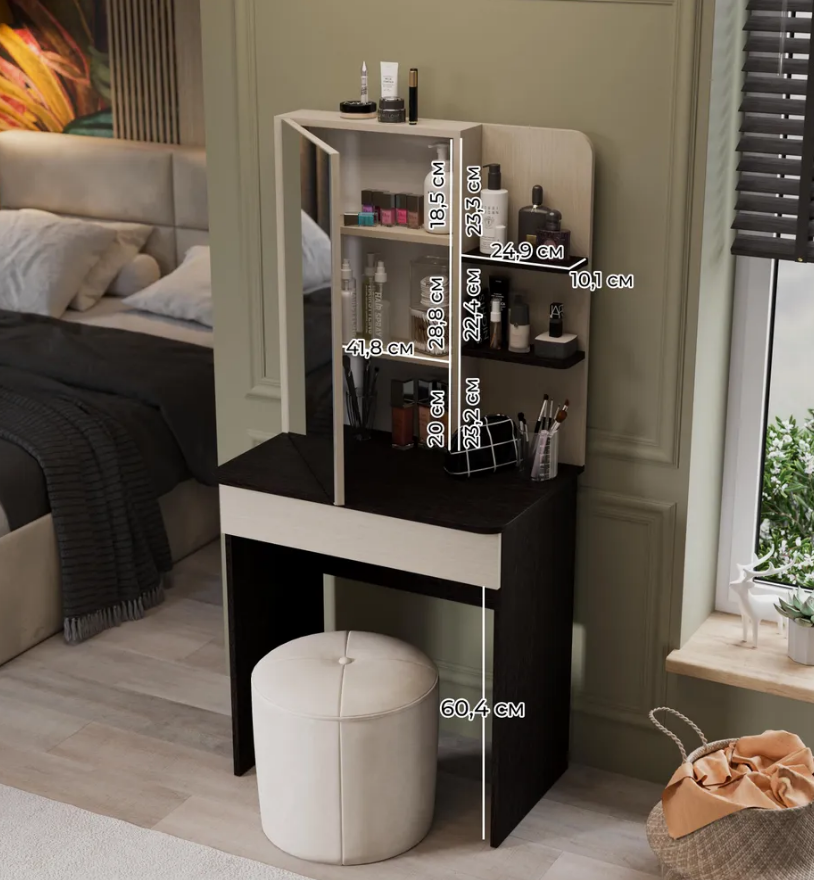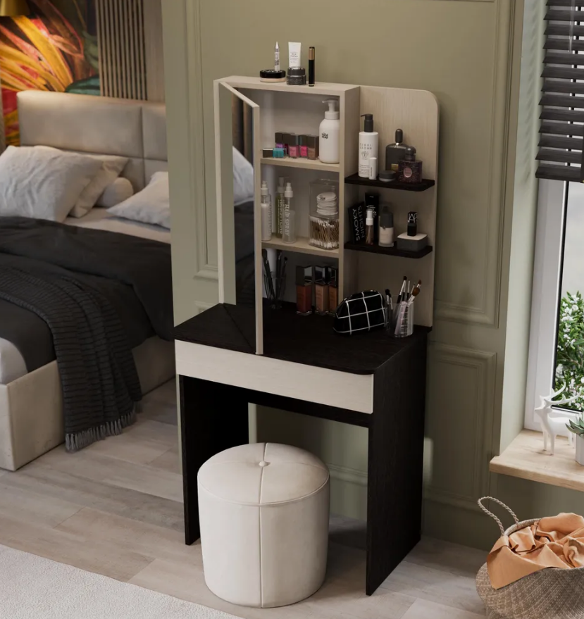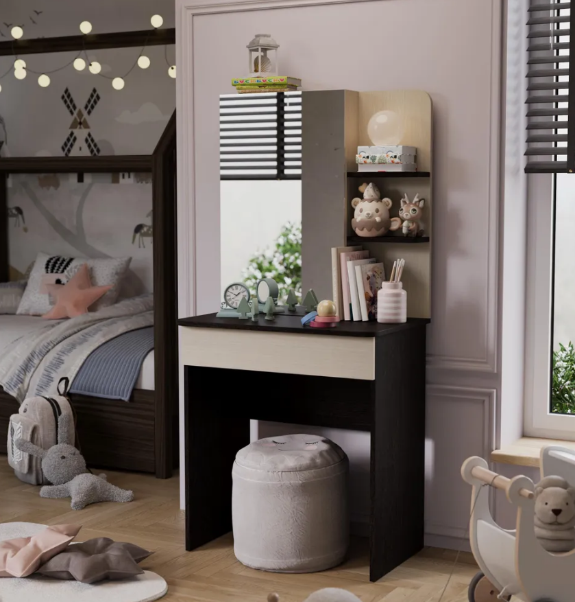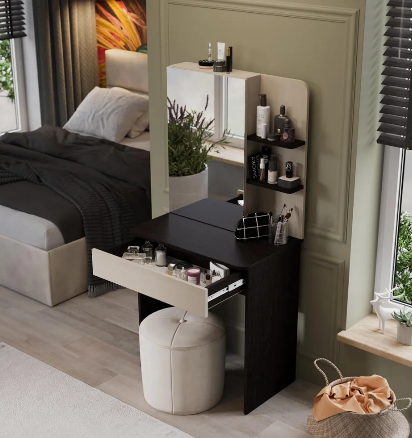 • Каркас новинки выполнен из прочной ламинированной древесно-стружечной плиты, обработанной кромкой ПВХ, которая устойчива к сколам и механическим повреждениями и сохраняет свой первоначальный цвет даже под воздействием солнца. При этом материалы экологически безопасны и соответствуют высоким стандартам качества. • В туалетном столике «Майя» есть приятное дополнение. За зеркалом имеются дополнительные скрытые полки для хранения, которые спасут столик от загромождённости и освободят место для предметов декора.