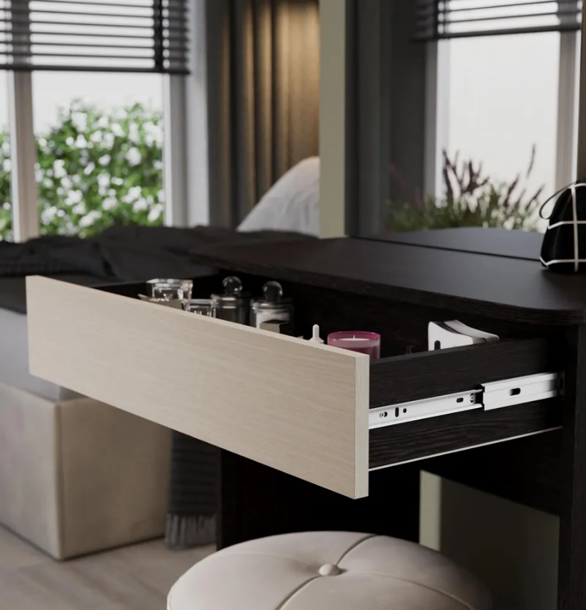 • У столика «Майя» имеется практичный ящик для хранения, в который можно складывать необходимые мелочи. Открывается он с помощью захвата руки, а шариковые направляющие обеспечивают плавное и бесшумное открывание.